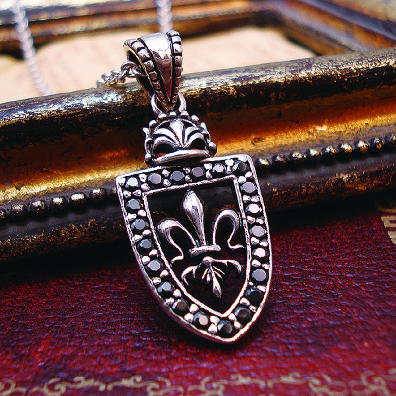 SILVER925 Pendant TOP -シルバー925 ブラックジルコニア 百合の紋章 シールド ペンダントTOP -
