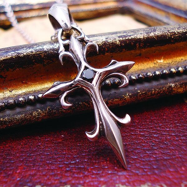 SILVER925 Pendant TOP -シルバー925 ブラックジルコニア 百合の紋章 クロス ペンダントTOP -